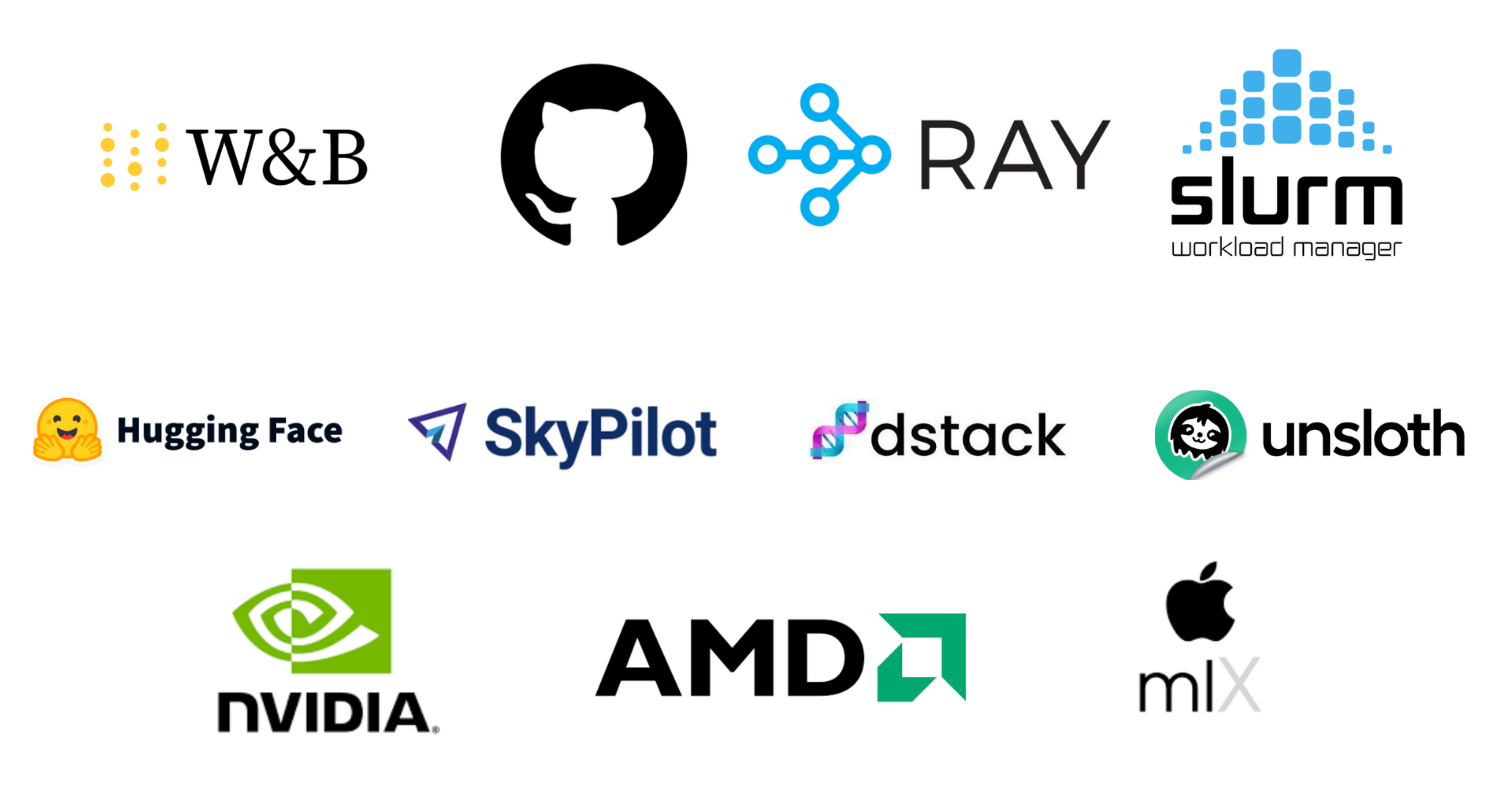 Transformer Lab integrates directly with Weights & Biases, GitHub, SkyPilot, Slurm, and Kubernetes. It provides a flexible, framework-agnostic environment to run Ray, Hugging Face TRL, Unsloth, PyTorch, or MLX tasks on any compute hardware (NVIDIA, AMD, TPUs, or Apple Silicon).