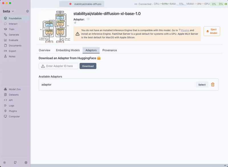 - Browse available LoRA adaptors or download specific ones from HuggingFace