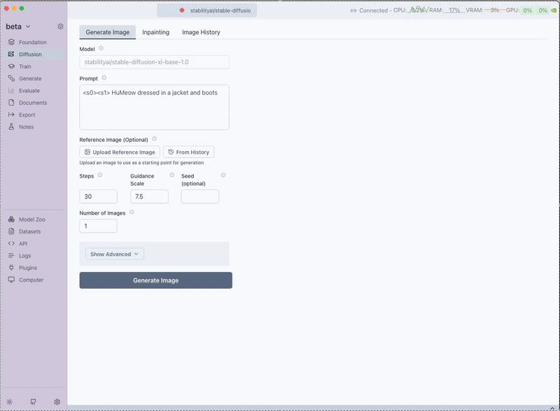 Transformer Lab supports downloading and using LoRA (Low-Rank Adaptation) adaptors from Hugging Face to enhance your diffusion models with specialized styles, subjects, or techniques. These adaptors can dramatically change the output style while using the same base model.