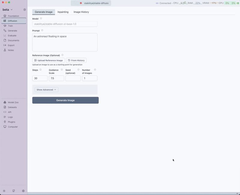 - Navigate to the Diffusion tab (appears in place of the Interact tab when a supported diffusion model is selected)